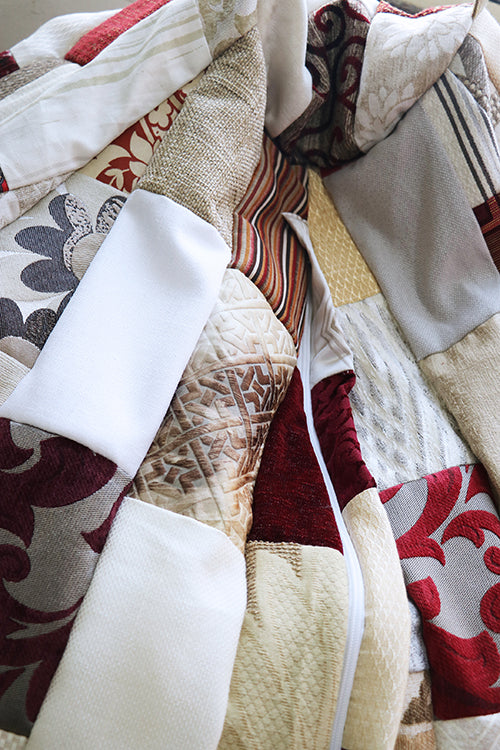 Each piece is made using curated reclaimed textiles, ensuring subtle tonal variation while maintaining collection cohesion.