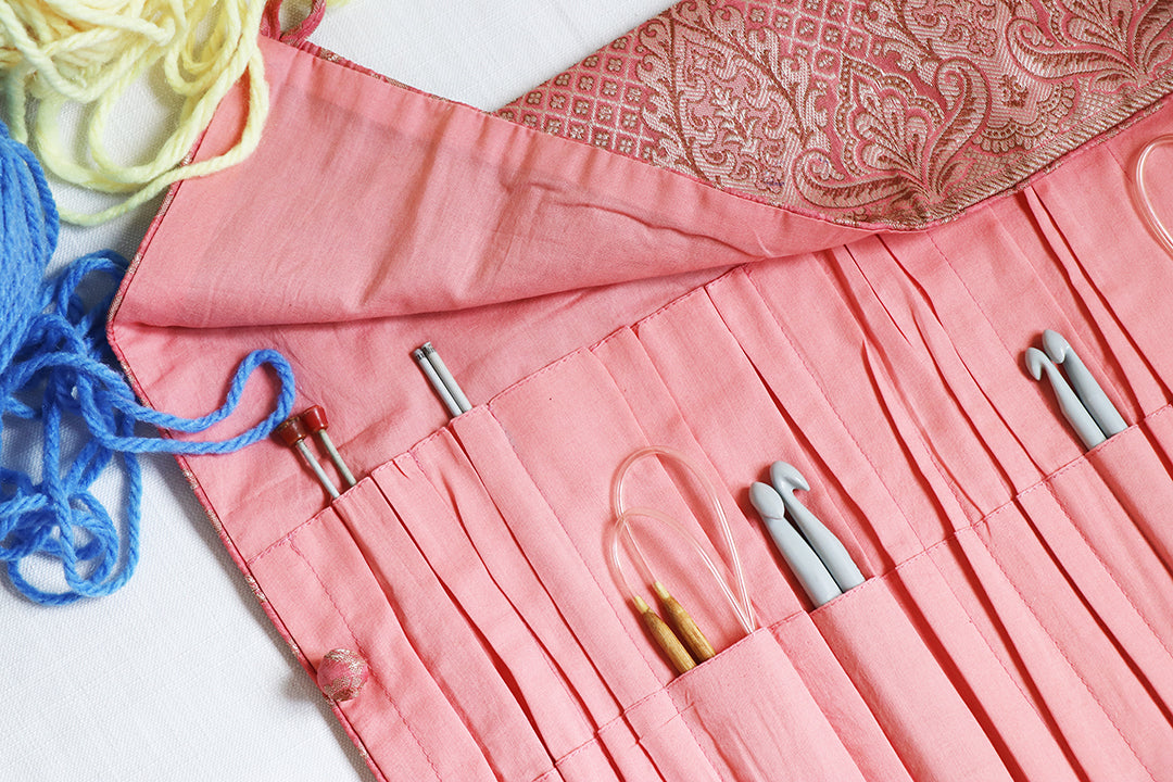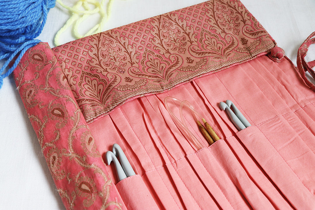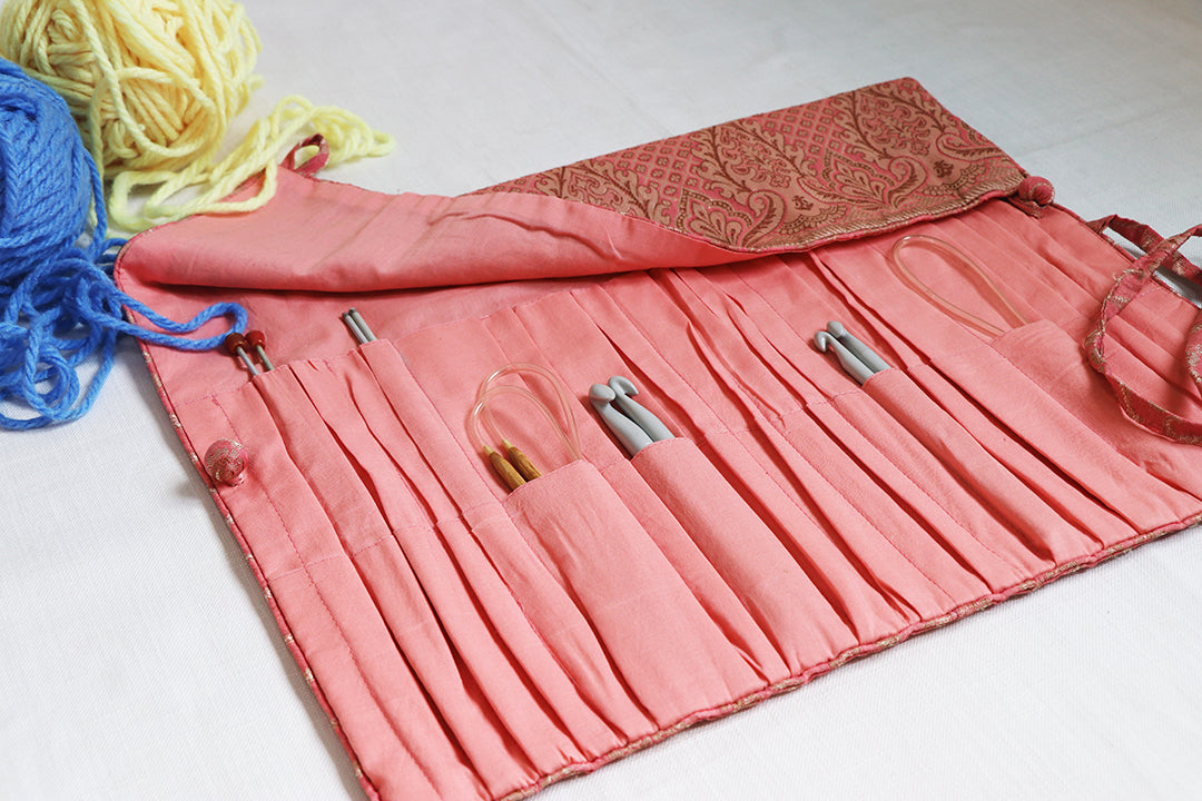 An easy way to carry all your knitting needles instead of having them in different packets. An organizer consisting of pockets at different levels which would easily fit in crotchet needles to knitting needles of various sizes.