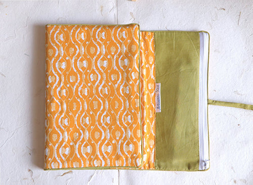 Stationery Kit | Block Printed Yellow Multipurpose Notebook Case | Roll-Up Pencil Case | Spiral Notebook | Set of 3