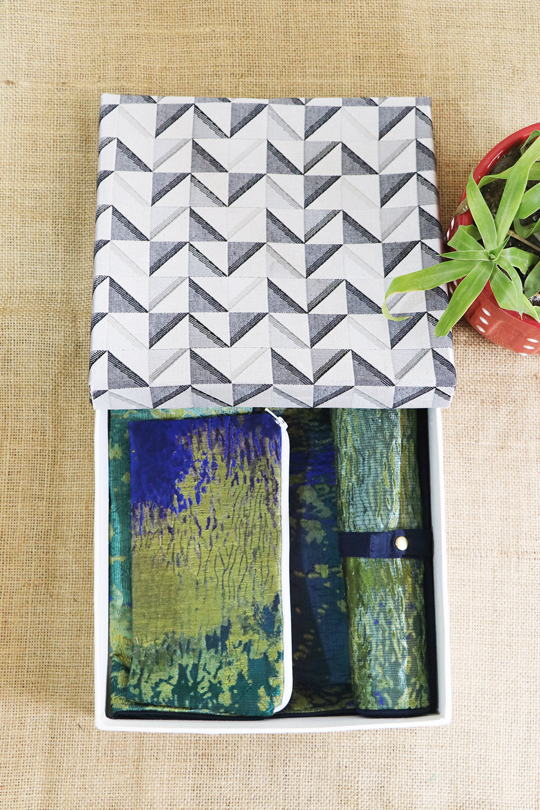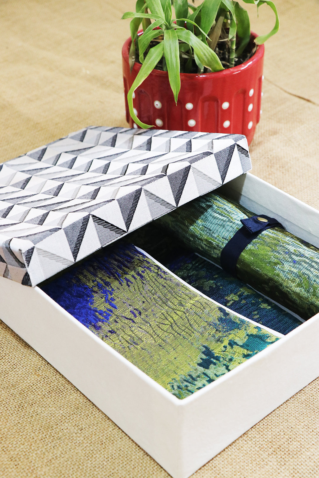 Gift Boxes can be customised according to size upholstered with preconsumed fabric pieces and handmade paper making your boxes sustainable, eco friendly and apt for corporate gifting.