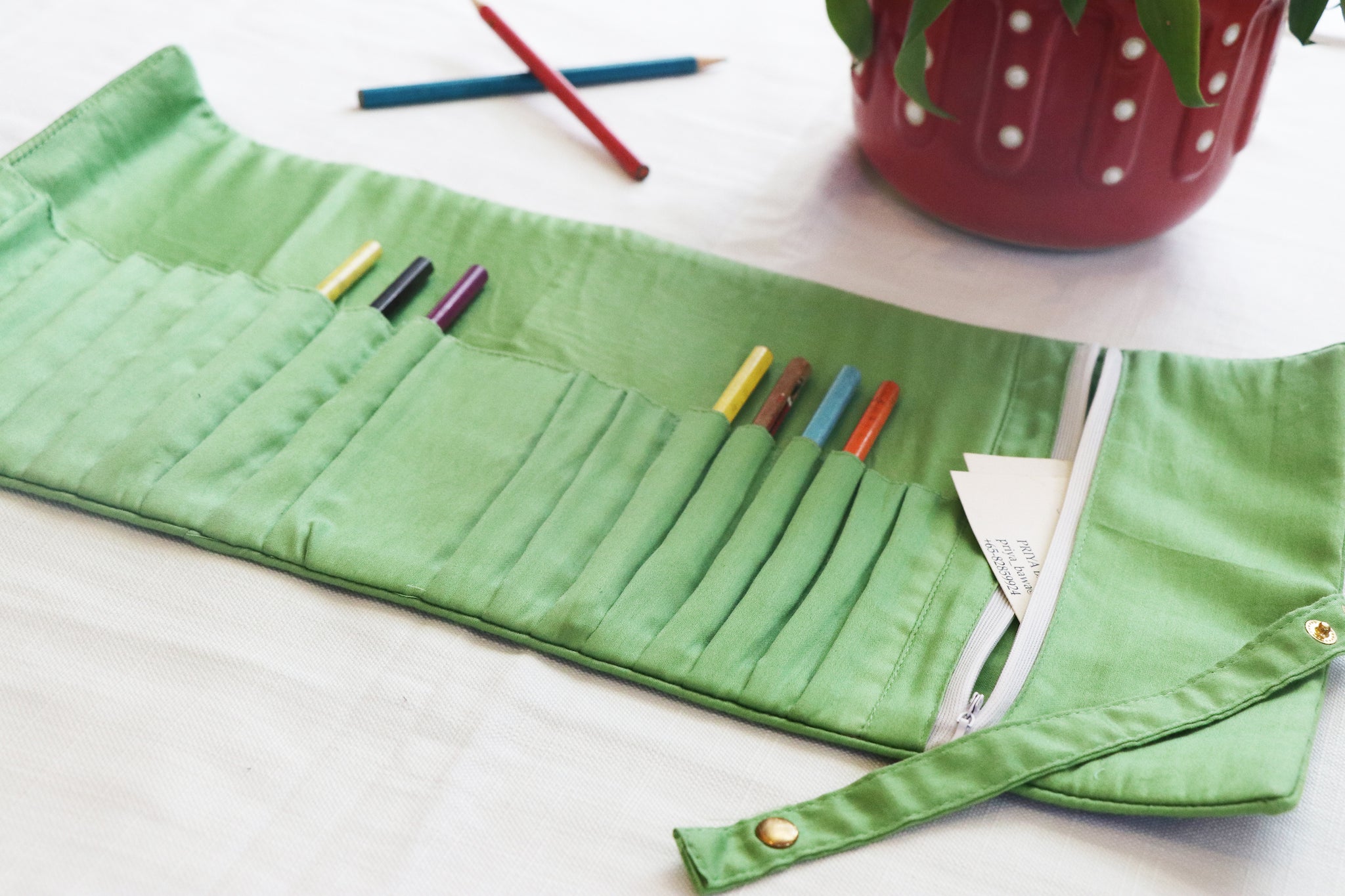 Roll Up Pen Case: This multipurpose pencase is a very versatile product which can be used by corporates for their daily pens and stationery, painters for their brushes, crochet needle holder for knitters, colour pencils etc. It also comes with a zipper which can store any extra stationery like erasers, sharpeners, pendrives.